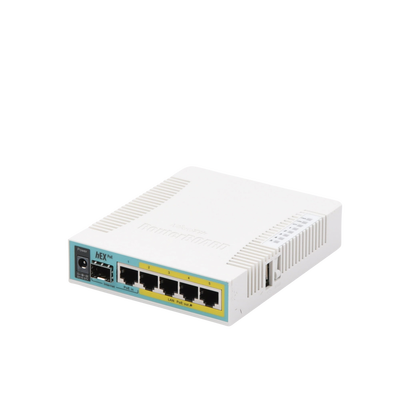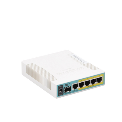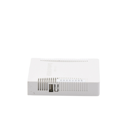 hEX PoE es un router Gigabit Ethernet de cinco puertos para lugares donde no se requiere conectividad inalámbrica. El dispositivo tiene un puerto USB 2.0 y un puerto SFP para la adición de conectividad de fibra óptica. Los puertos 2-5 pueden alimentar otros dispositivos capaces de PoE con la misma tensión que se aplica a la unidad.