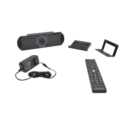 Sistema de videoconferencia GVC3210, control remoto, 4 pilas AAA, fuente de alimentación universal, cable de red (1.5 metros), 2 cables HDMI (1.5 metros y 5 metros), paño de limpieza para lente, kit de montaje, guía de instalación rápida, licencia GPL